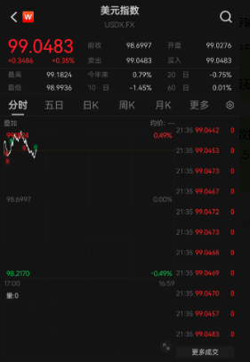 前一交易日,美元指数收盘贬0.12%,报98.70。